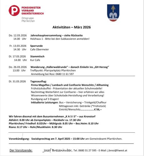 Pensionistenverband Pfarrkirchen – Aktivitäten März 2026